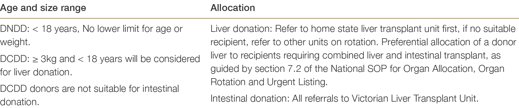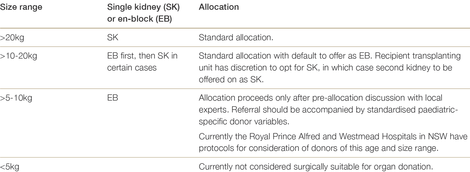 The recommendations below reflect local and international experience and current evidence with respect to paediatric donation and transplantation. However, it is acknowledged that there is a spectrum of experience with respect to the transplantation of organs from small paediatric donors and not all units will feel it is appropriate to consider all donors according to the criteria below. In order to facilitate the pathway for donation and allocation of these organs, transplant units should develop their own protocols for acceptance of paediatric donors, guided by the recommendations below as well as local expertise and other relevant considerations.