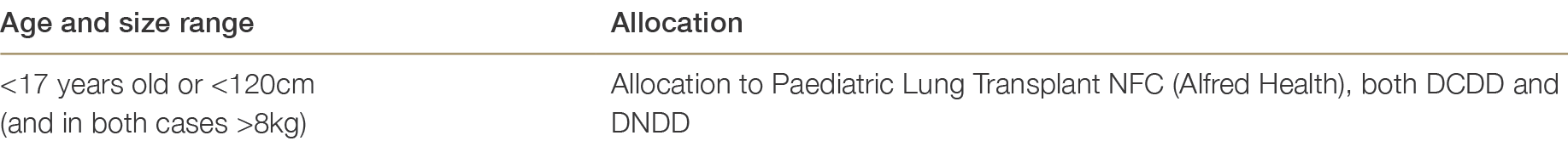 The recipient criteria are set out by the Nationally Funded Centre (NFC) for Paediatric Lung and Heart-Lung Transplantation and supports lung transplantation for children ≥4 years and >10kg. Reflecting that children this small may have restrictive lung disease and a small chest cavity, smaller paediatric donors may be suitable as per recommendations in Table 11.3.