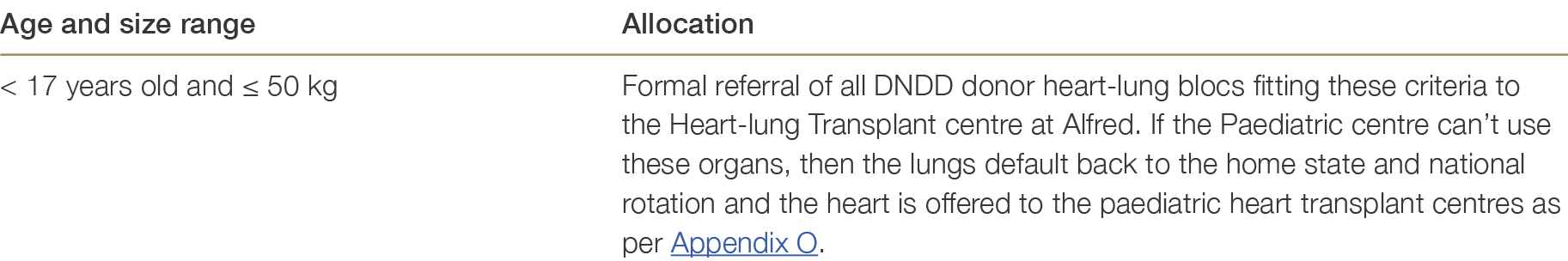 Paediatric donors with both heart and lungs suitable for use as a bloc should be referred to the Paediatric Heart Lung Transplant Centre at the Alfred – see 11.5.1 below.