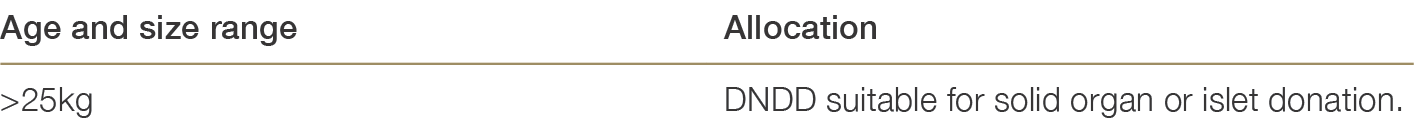 Paediatric DNDD donors >25kg are suitable for pancreatic donation. These should initially be offered for solid organ donation and, if not allocated, then offered for islet donation.