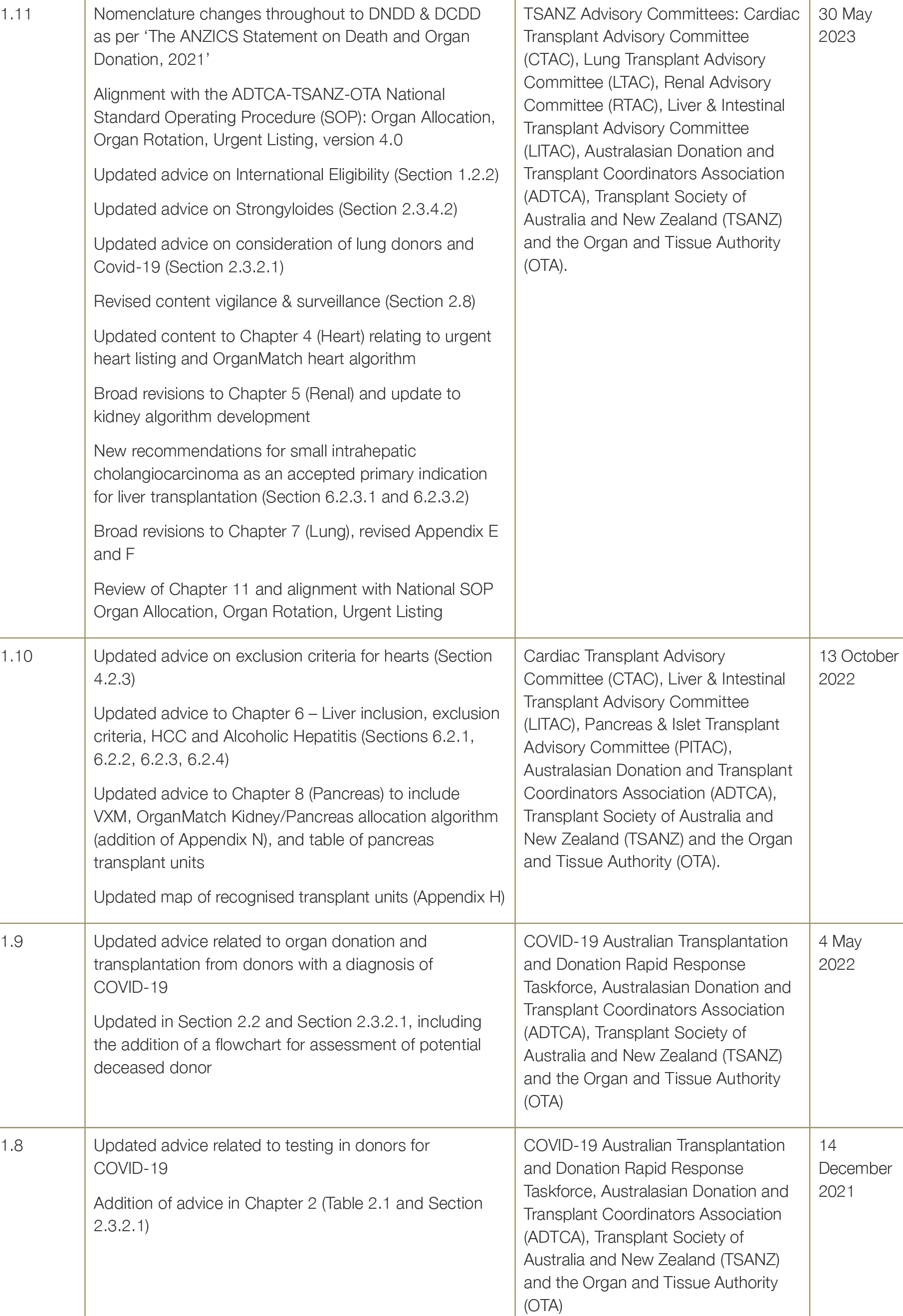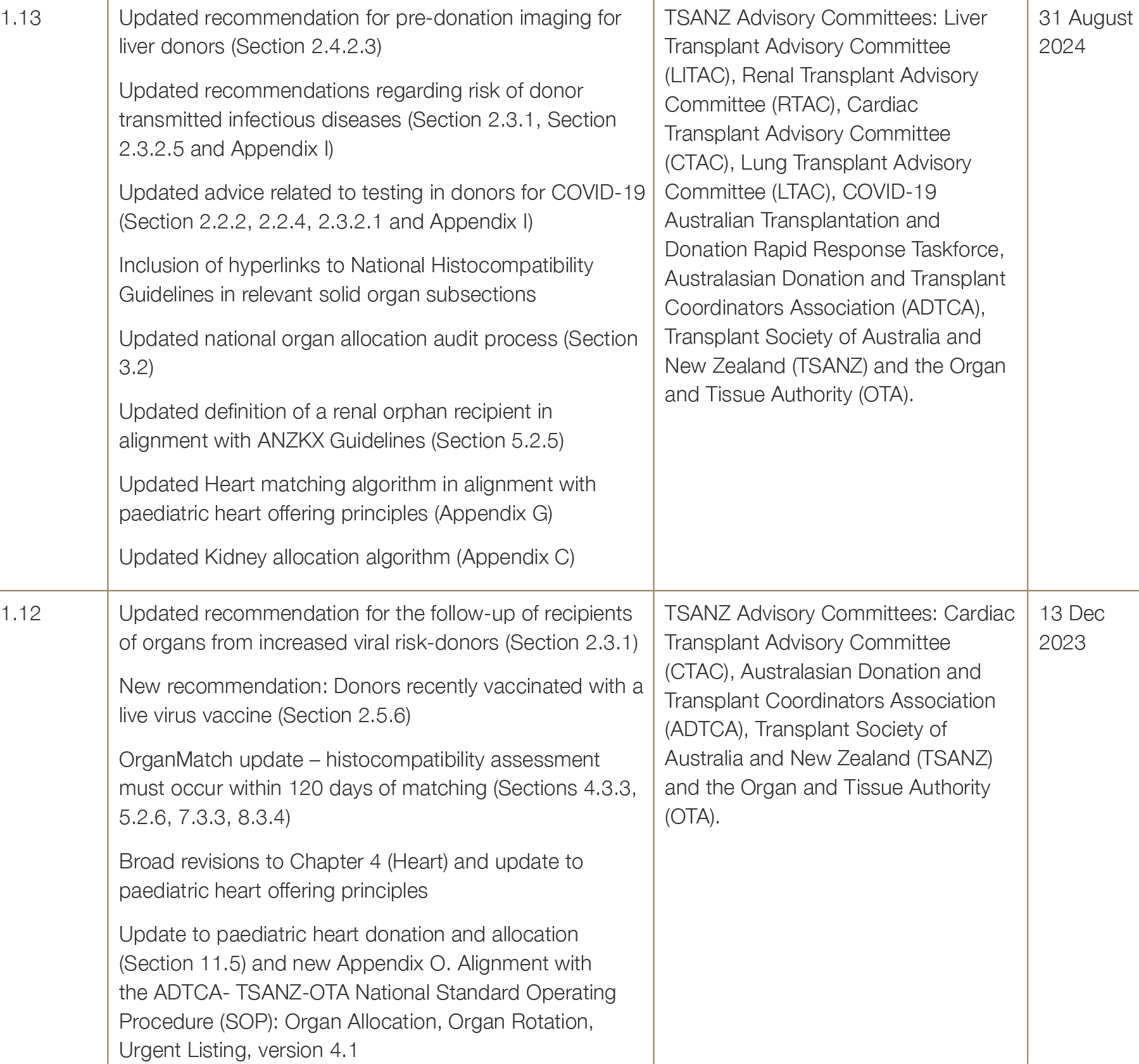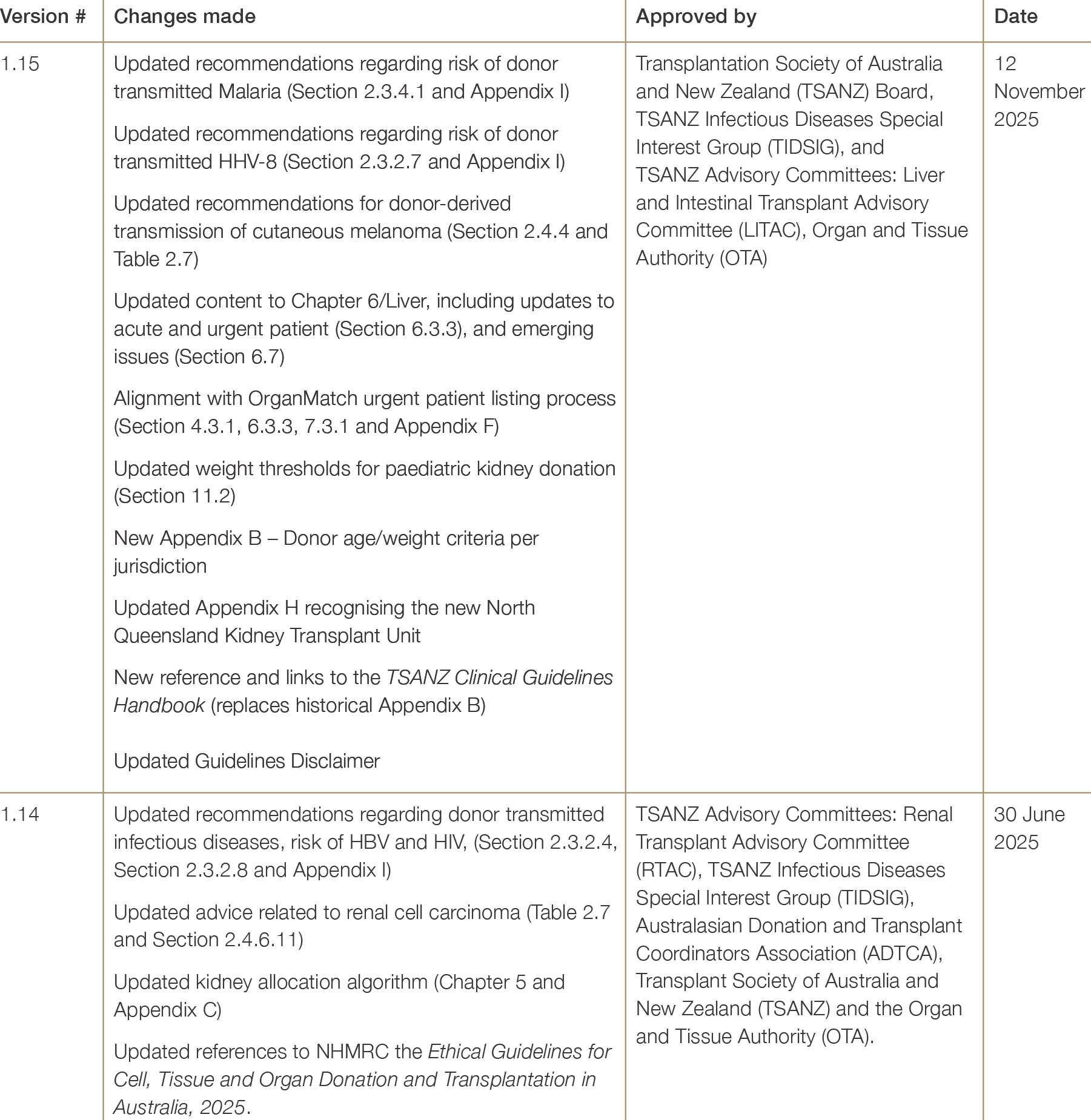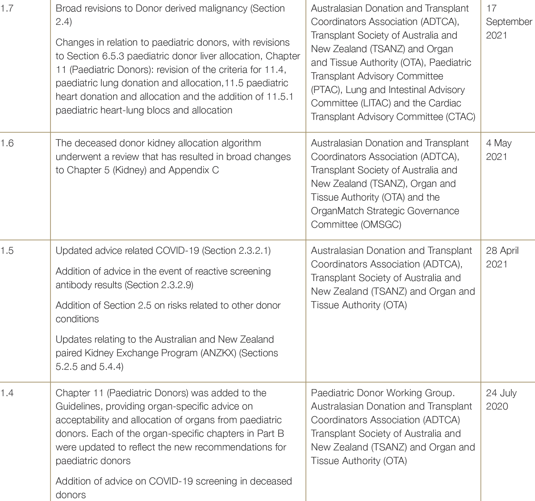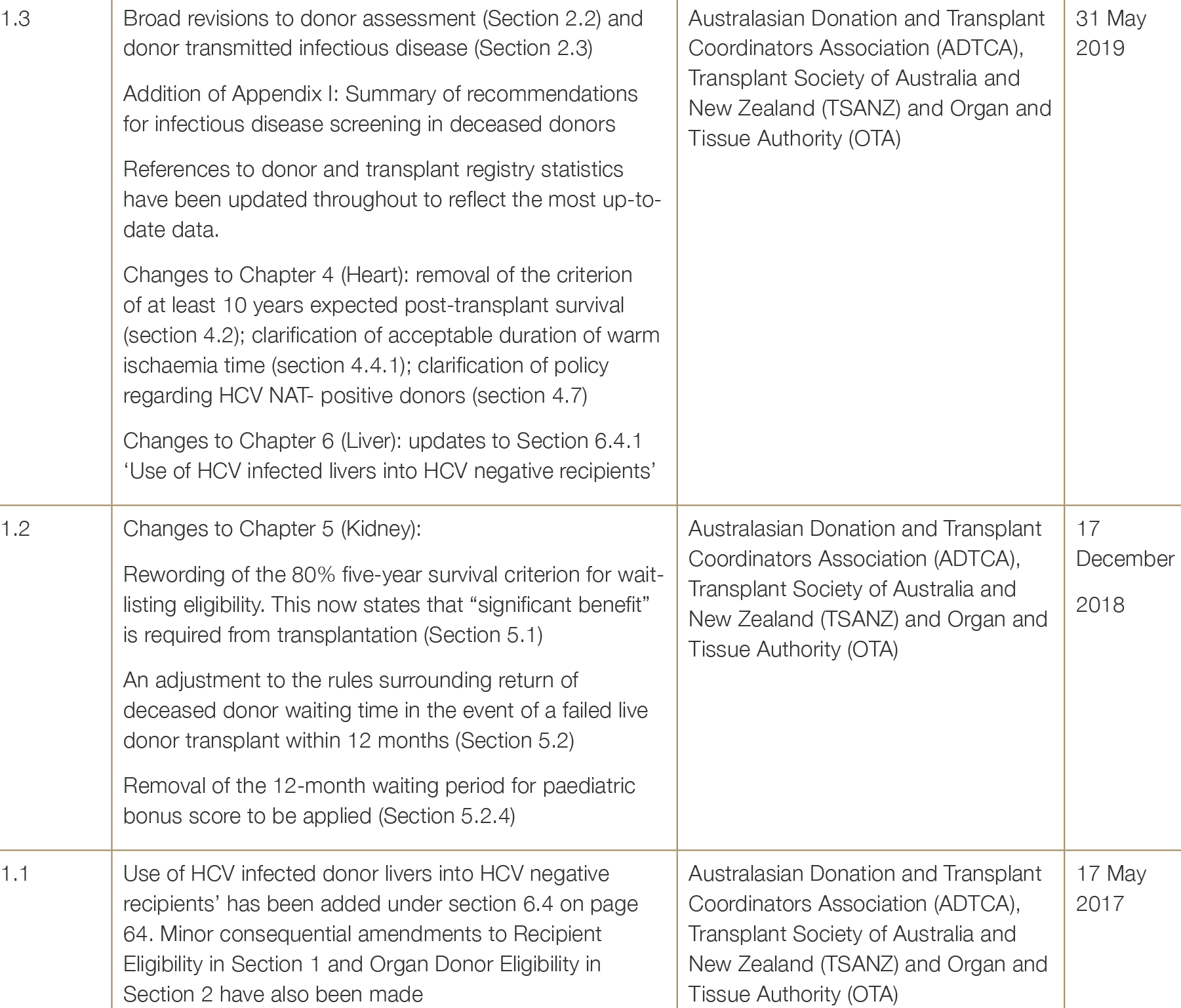 Version 1.0 of the Clinical Guidelines for Organ Transplantation from Deceased Donors (the Clinical Guidelines) was released in April 2016. Updates are summarised in the version control table below.