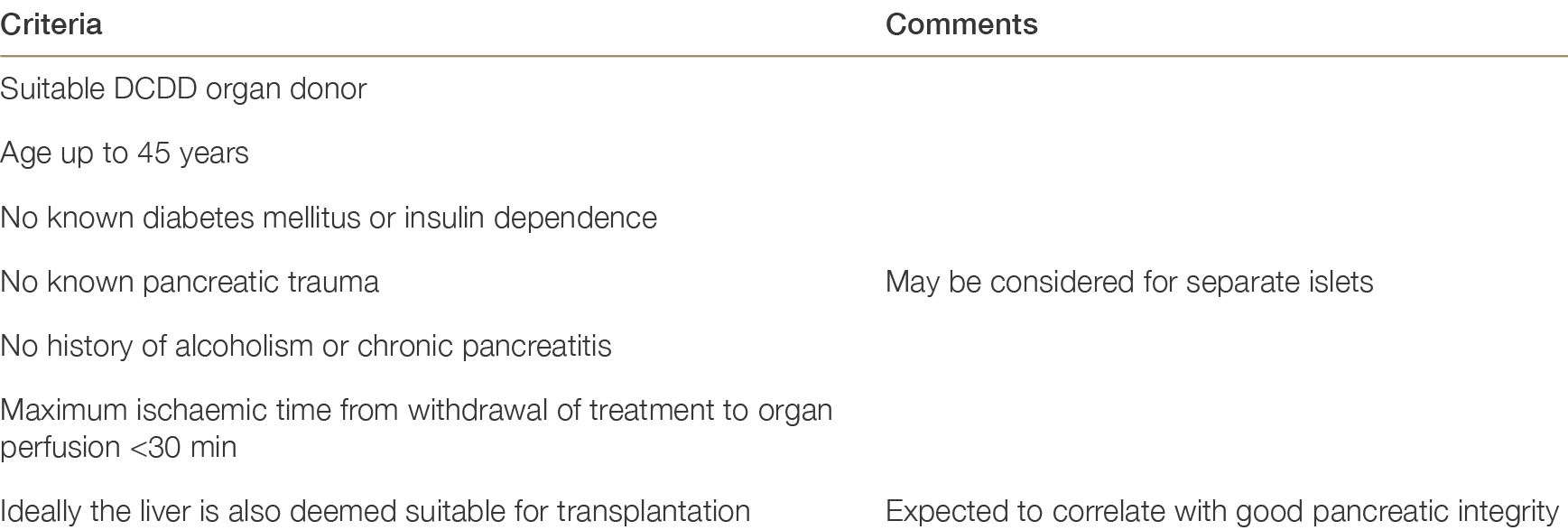 Donor suitability criteria are listed in Table 8.1 and Table 8.2. Similar to the selection process for other organs, donor suitability criteria for pancreas transplantation are based on factors that may adversely impact the success of the procedure,22-26 as well as factors related to recipient safety (e.g. infection risk or transmission of malignancy). DNDD and DCDD donors are suitable for solid organ pancreas transplantation (usually SPK transplantation), although thrombosis rates are higher from DCDD compared with DNDD organs. Within DNDD organs, thrombosis rates are higher in donors over 35 years of age. Currently, islet yields from DCDD donors are insufficient for transplantation, hence these donors are only considered at present for solid organ pancreas donation (in the case of paediatric donors, only DNDD donors are suitable for pancreas donation – see Chapter 11). Suitability criteria for pancreas donation from DCDDs are given in Table 8.3: Extended suitability criteria for pancreas donation after circulatory death.24,2722 Salvalaggio PR, Schnitzler MA, Abbott KC, et al. Patient and graft survival implications of simultaneous pancreas kidney transplantation from old donors. Am J Transplant, 2007; 7: 1561–71. 23 Neidlinger NA, Odorico JS, Sollinger HW, et al. Can ‘extreme’ pancreas donors expand the donor pool? Curr Opin Organ Transplant, 2008; 13: 67–71. 24 Suh N, Ryan B, Allen R, et al. Simultaneous pancreas and kidney transplantation from organ donation after cardiac death. ANZ J Surg, 2009; 79: 245–46. 25 Weiss AS, Smits G and Wiseman AC. Standard criteria donor pancreas donation status is associated with improved kidney transplant outcomes. Clin Transplant, 2009; 23: 732–39. 26 Humar A, Ramcharan T, Kandaswamy R, et al. The impact of donor obesity on outcomes after cadaver pancreas transplants. Am J Transplant, 2004; 4: 605–10. ×24 Suh N, Ryan B, Allen R, et al. Simultaneous pancreas and kidney transplantation from organ donation after cardiac death. ANZ J Surg, 2009; 79: 245–46. 27 D’Alessandro AM, Fernandez LA, Chin LT, et al. Donation after cardiac death: the University of Wisconsin experience. Ann Transplant, 2004; 9:68-71. ×