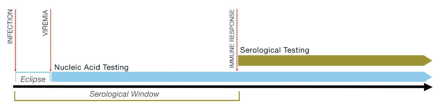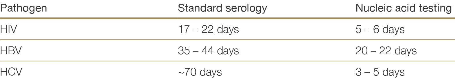 In addition, the concept of the “eclipse” or “window” period of infection is critical to understanding donor infectious disease risk mitigation. Following infection by a microbiological agent, there is a period of time during which no microbe can be readily detected in the host; this is called the “window period” for serological testing, or the “eclipse period” for NAT (see Figure 2.1). Unexpected transmissions are most likely to occur if the donor has recently acquired the infection and is still in the eclipse/window period before detection is possible. As such, test results must be interpreted in the context of the patient’s full history, and the probability of false negative results needs to be considered against the donor’s background of any reported risk factors such as IVDU or high-risk sexual contact.