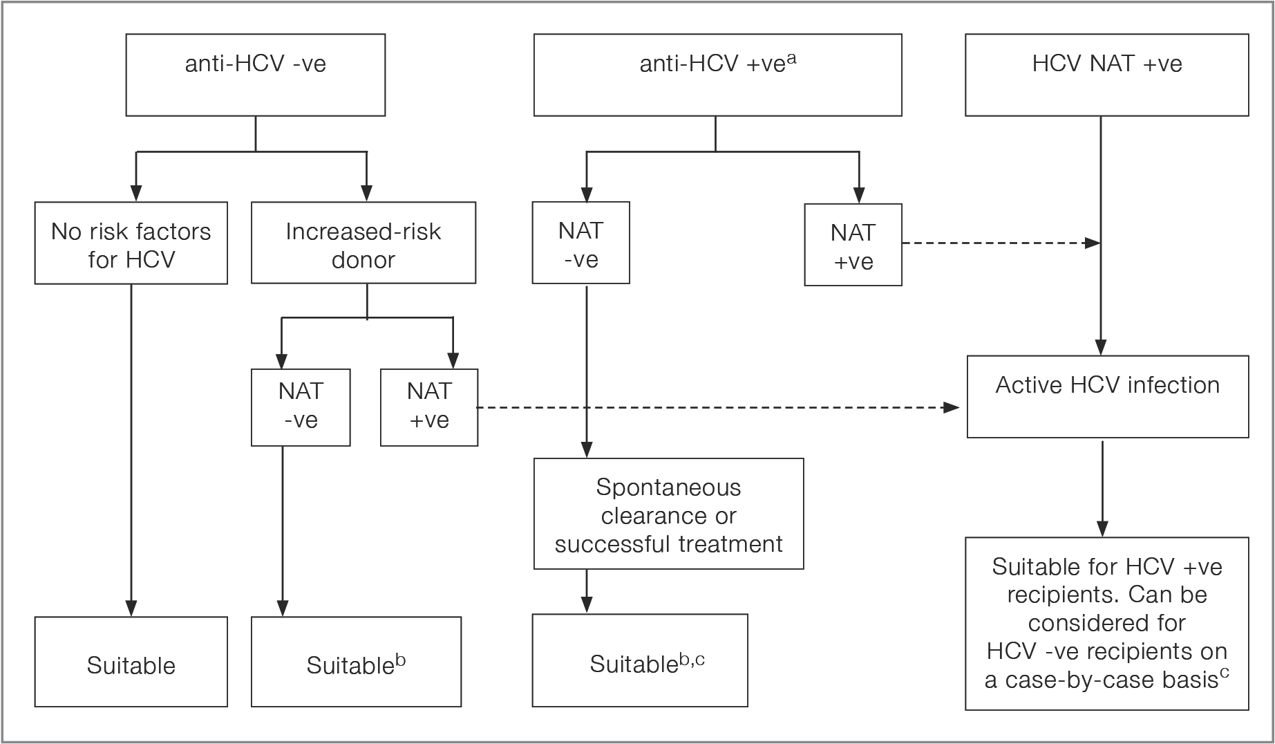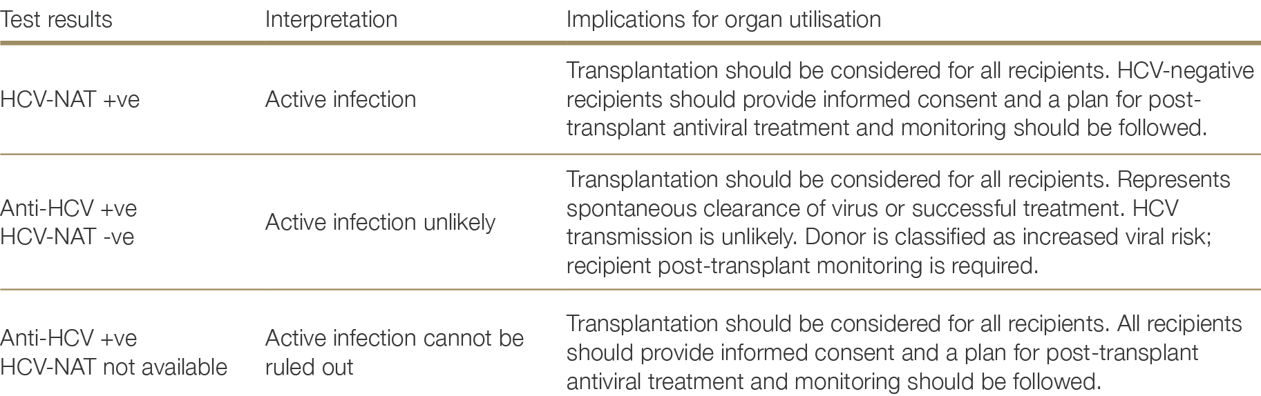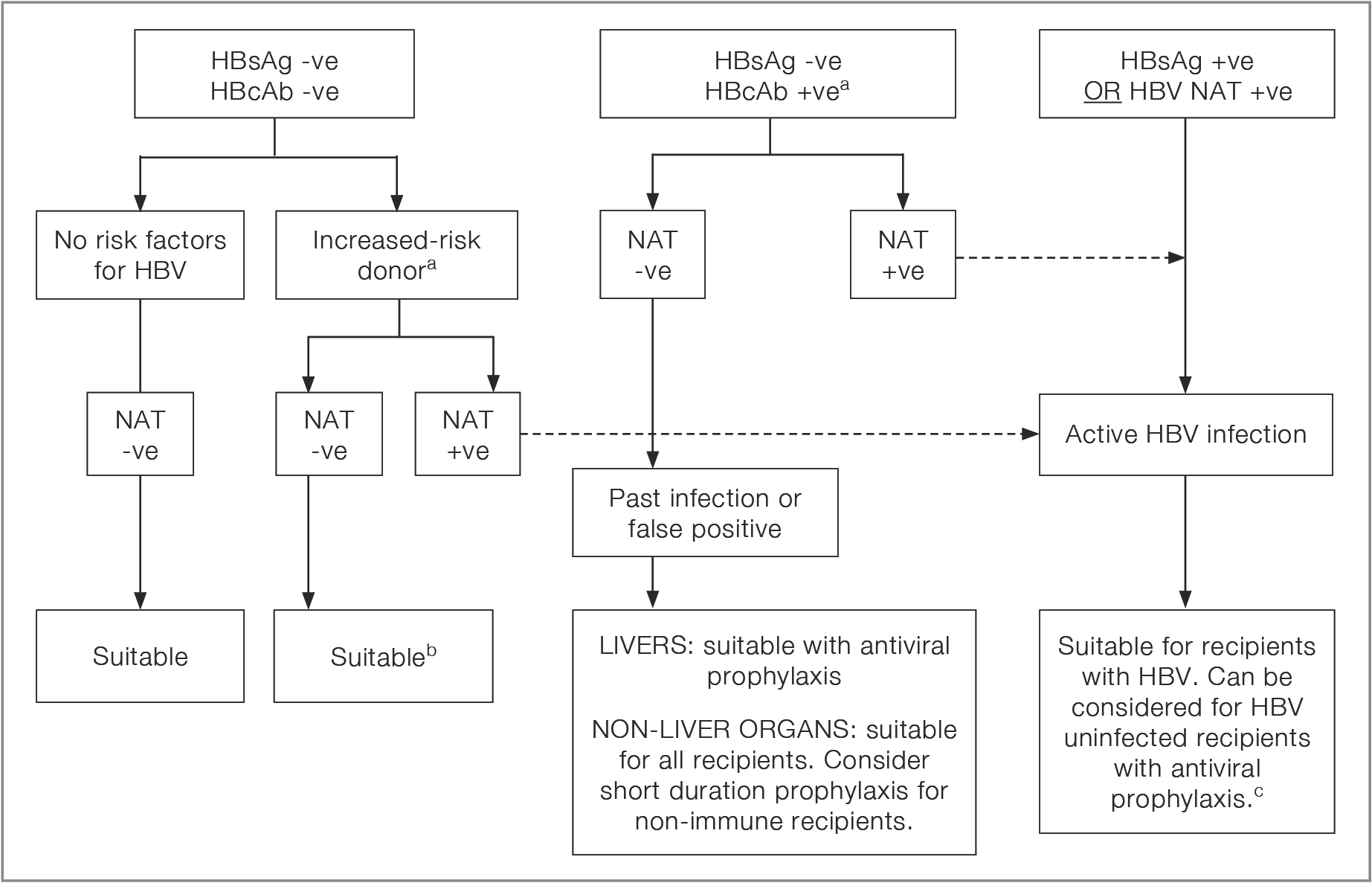 The unexpected transmission of HIV, HCV or HBV through transplantation is rare, particularly in the setting of thorough patient history, examination and laboratory testing (serology and NAT). While it is important to stratify donor risk of blood-borne virus acquisition, increasingly organs from otherwise suitable donors with increased risk for HIV, HCV or HBV infection are being used to expand the donor pool both in Australia and overseas. Recipients of increased risk donor organs have similar overall and graft survival compared to recipients from other donors.12,13,14 Organ recipients in the United States who declined donors with increased risk had worse long-term survival than recipients who accepted increased risk donor, probably due to prolonged waiting times.15,16,1712 Kizilbash SJ, Rheault MN, Wang Q et al. Kidney transplant outcomes associated with the use of increased risk donors in children. Am J Transplant. 2019 Jun;19(6):1684-1692. 13 Xie MW, Kennan SP, Slaunwhite A, Rose C. Observational Study Examining Kidney Transplantation Outcomes Following Donation From Individuals That Died of Drug Toxicity in British Columbia, Canada. Can J Kidney Health Dis. 2023 Apr 4;10:20543581231156853. 14 Okoh AK, Chan O, Schultheis M et al. Association between increased-risk donor social behaviors and recipient outcomes after heart transplantation. Clin Transplant. 2020 Mar;34(3):e13787 ×15 Bowring MG, Holscher CM, Zhou S et al. Turn down for what? Patient outcomes associated with declining increased infectious risk kidneys. Am J Transplant. 2018 Mar;18(3):617-624. 16 Cox ML, Mulvihill MS, Choi AY et al. Implications of declining donor offers with increased risk of disease transmission on waiting list survival in lung transplantation. J Heart Lung Transplant. 2019 Mar;38(3):295-305. 17 Mulvihill MS, Cox ML, Bishawi M et al. Decline of Increased Risk Donor Offers on Waitlist Survival in Heart Transplantation. J Am Coll Cardiol. 2018 Nov 6;72(19):2408-2409. ×