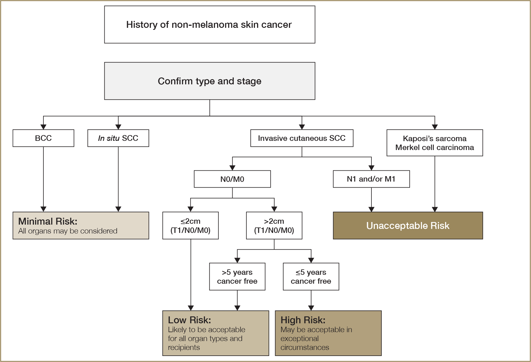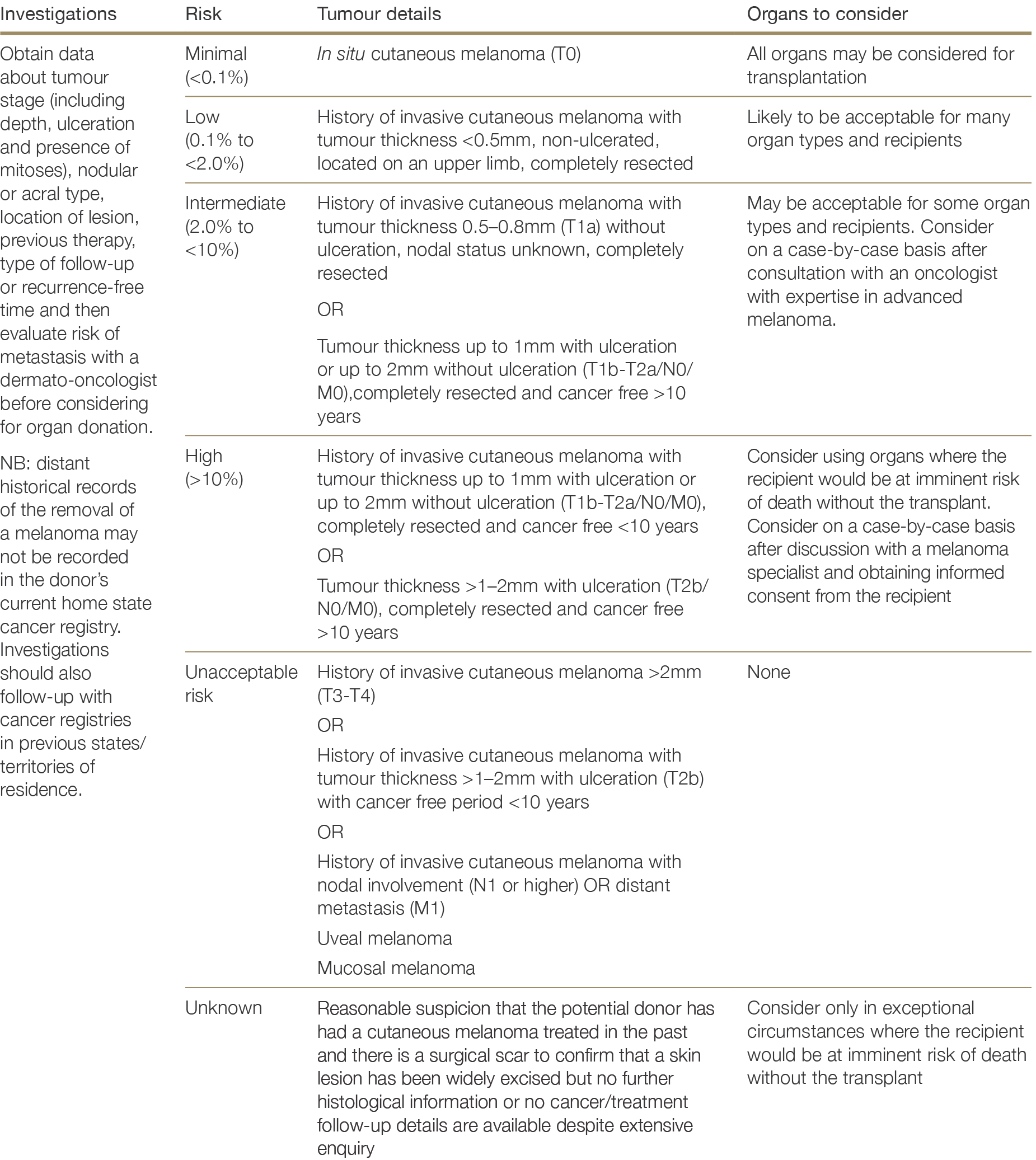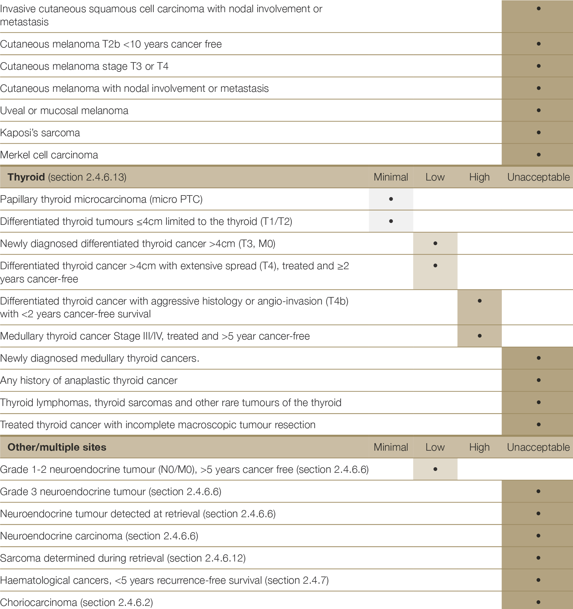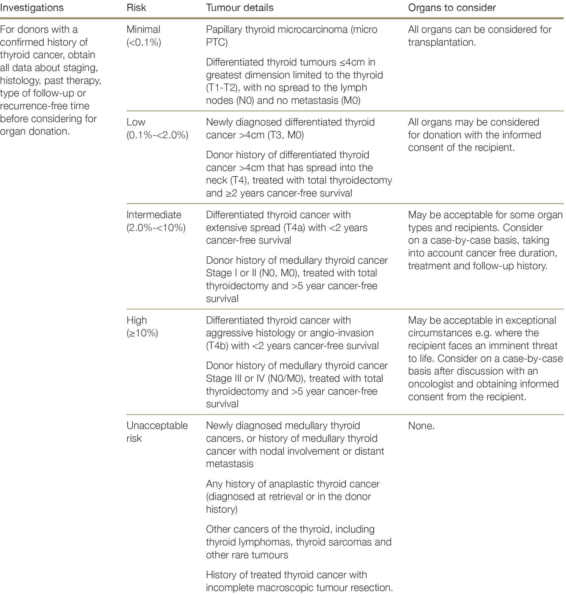 The risk of transmission of differentiated thyroid cancer from a donor to a solid organ recipient relates to the size of the tumour and whether it has spread beyond the thyroid. Differentiated thyroid cancers of up to 4cm in size and confined to the thyroid pose minimal risk of donor-derived malignancy transmission, even if detected at the time of organ retrieval. It is important to note that thyroid cancers do not seem to be affected by immunosuppression: pre-existing thyroid cancers do not show increased rates of progression and incidence of thyroid cancer is not elevated in recipients of non-kidney organs – in kidney transplant recipients the incidence of thyroid cancer is not above that of dialysis patients.334,335 In addition, even widely metastatic differentiated thyroid cancer is amenable to curative therapy, depending on its histology.327 Hence, even in the event of donor-derived transmission, there could be a reasonable expectation of curative treatment.334 Van Leeuwen MT, Webster A, McCredie MRE et al. Effect of reduced immunosuppression after kidney transplant on risk of cancer: population based retrospective cohort study. BMJ, 2010; 340: c570. Na R, Grulich AE, Meagher NS et al. Comparison of de novo cancer incidence in Australian liver, heart and lung transplant recipients. Am J Transplant, 2013; 13:174-183. 335 Na R, Grulich AE, Meagher NS et al. Comparison of de novo cancer incidence in Australian liver, heart and lung transplant recipients. Am J Transplant, 2013; 13:174-183.×327 Perros P, Colley PP, Boelaert K et al. British thyroid association guidelines for the management of thyroid cancer. Clinical Endocrinology, 2014; 81(Suppl 1) ×