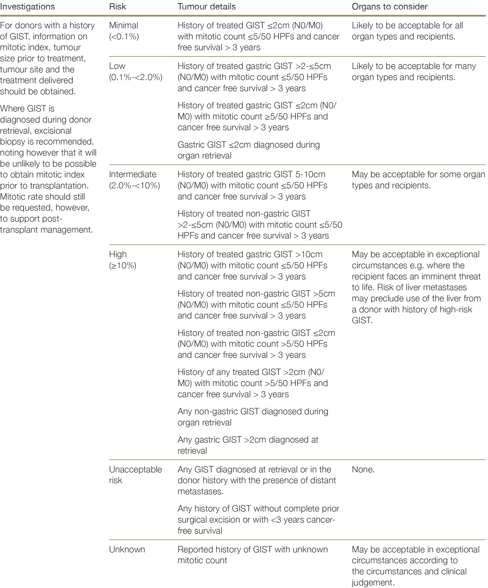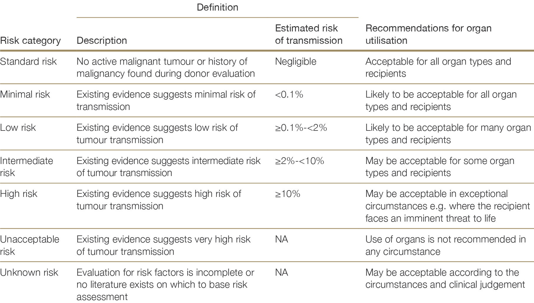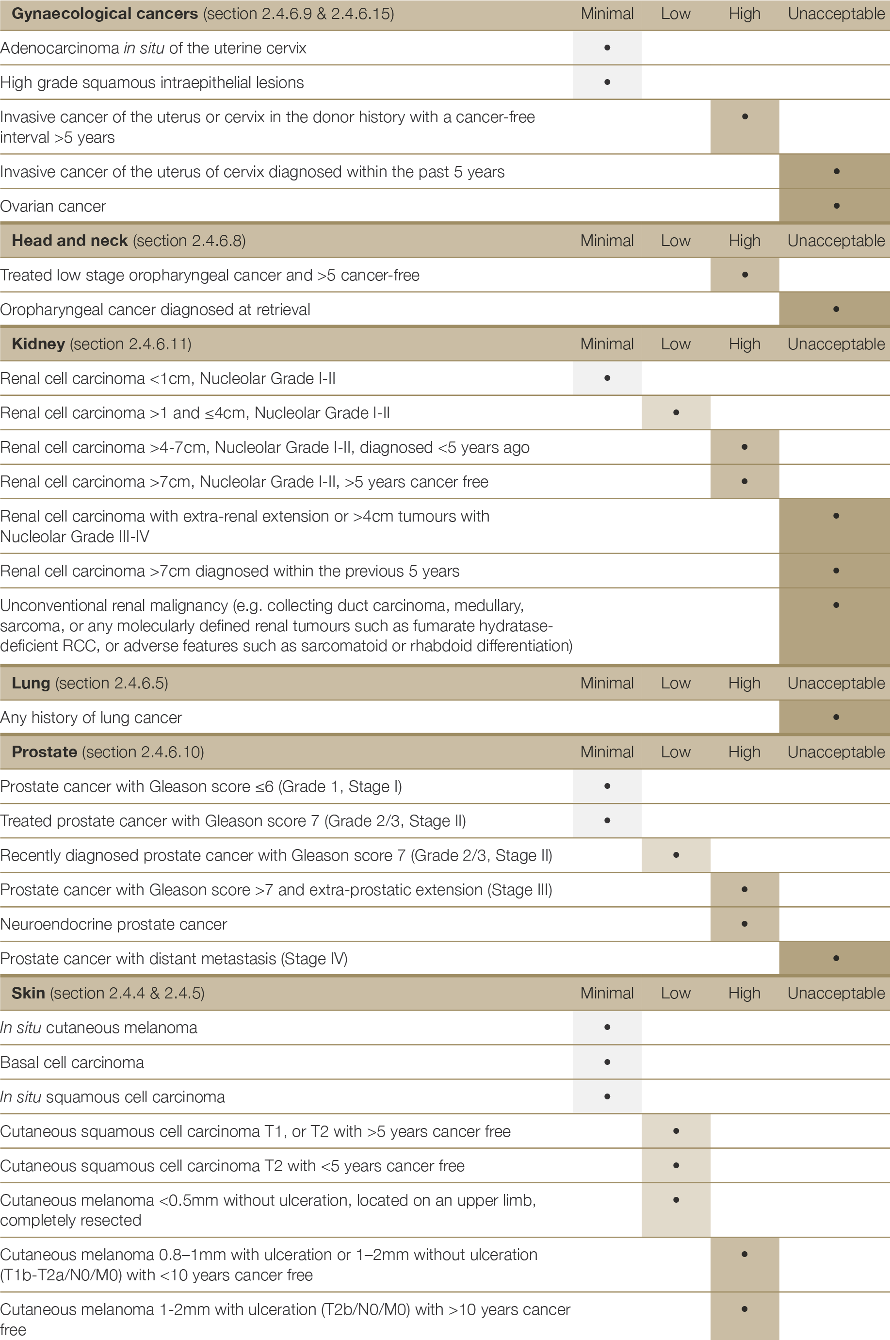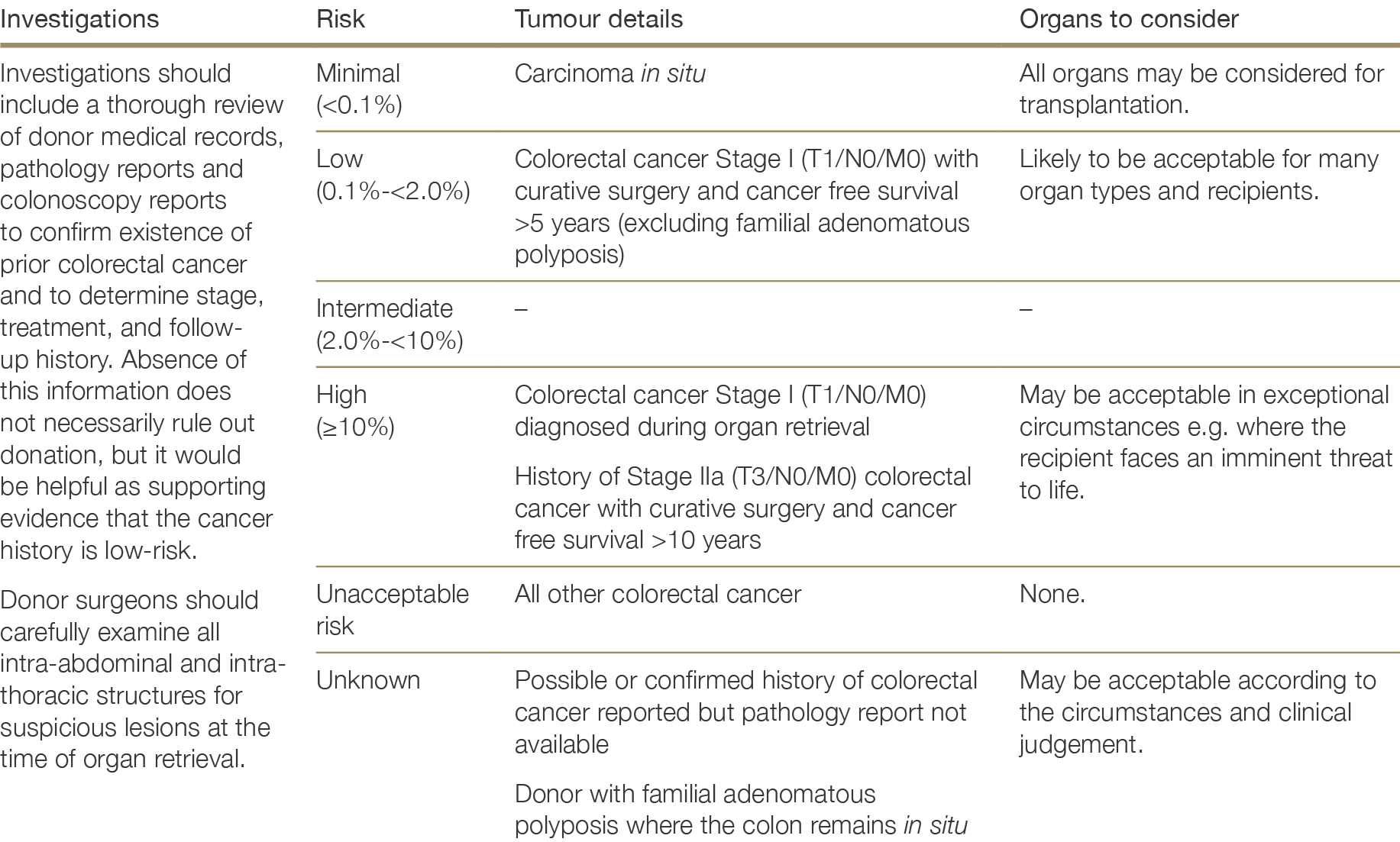 Isolated case reports from the literature demonstrate fatal outcomes of transplantation in the context of unrecognised donor sarcoma.324,325 However, given the vast array of possible soft tissue and bone sarcomas and their heterogeneity with regards risk of recurrence and potential risk of transmission to recipients, potential donors with a history of treated sarcoma and a substantial recurrence-free period should be considered on a case by case basis.324 Detry O, De Roover A, de Leval et al. Transmission of an undiagnosed sarcoma to recipients of kidney and liver grafts procured in a non-heart beating donor. Liver Transpl, 2005; 11(6):696-9. Thoning J, Liu J, Bistrup C et al. Transmission of angiosarcomas from a common multiorgan donor to four transplant recipients. Am J Transplant, 2013; 13(1):167-73. 325 Thoning J, Liu J, Bistrup C et al. Transmission of angiosarcomas from a common multiorgan donor to four transplant recipients. Am J Transplant, 2013; 13(1):167-73.×