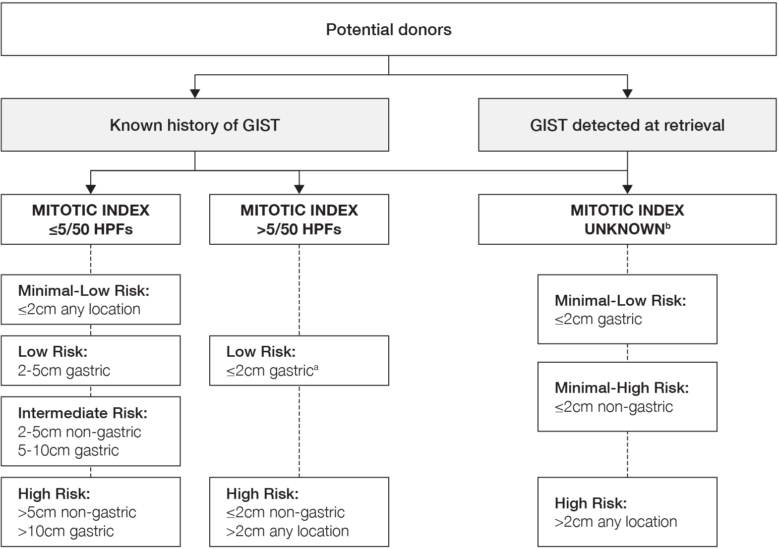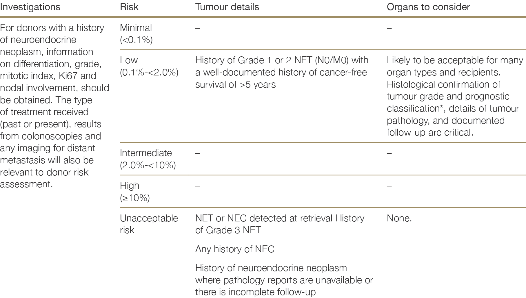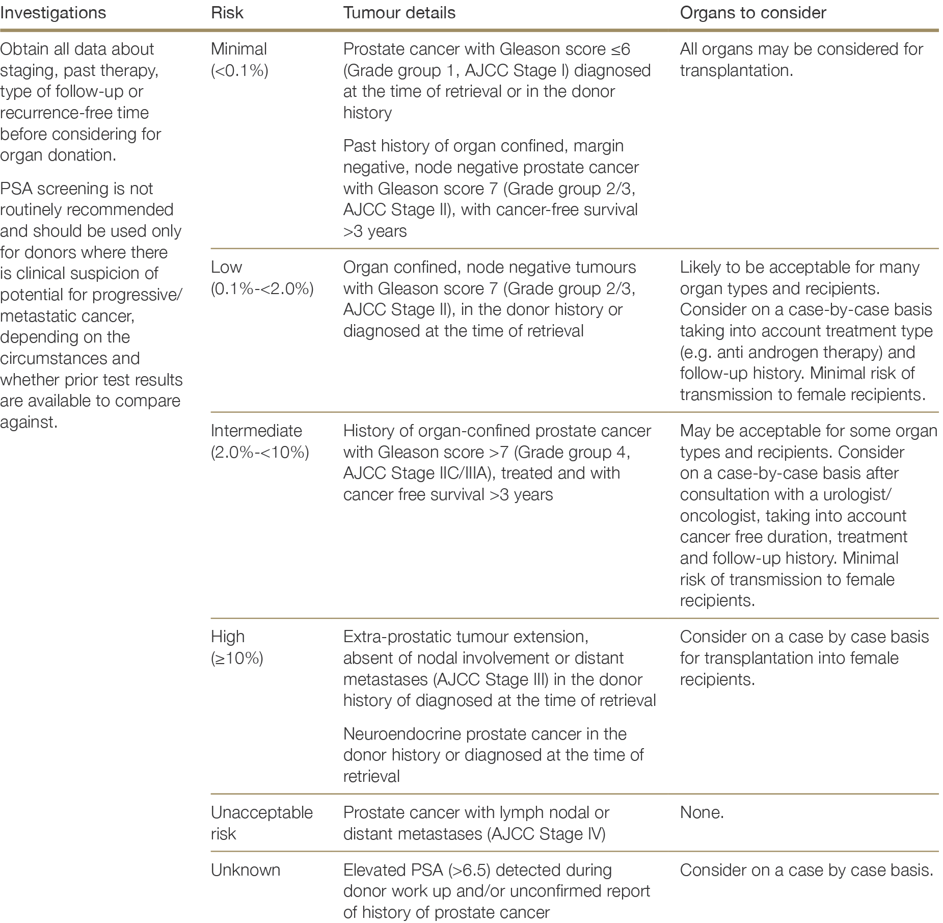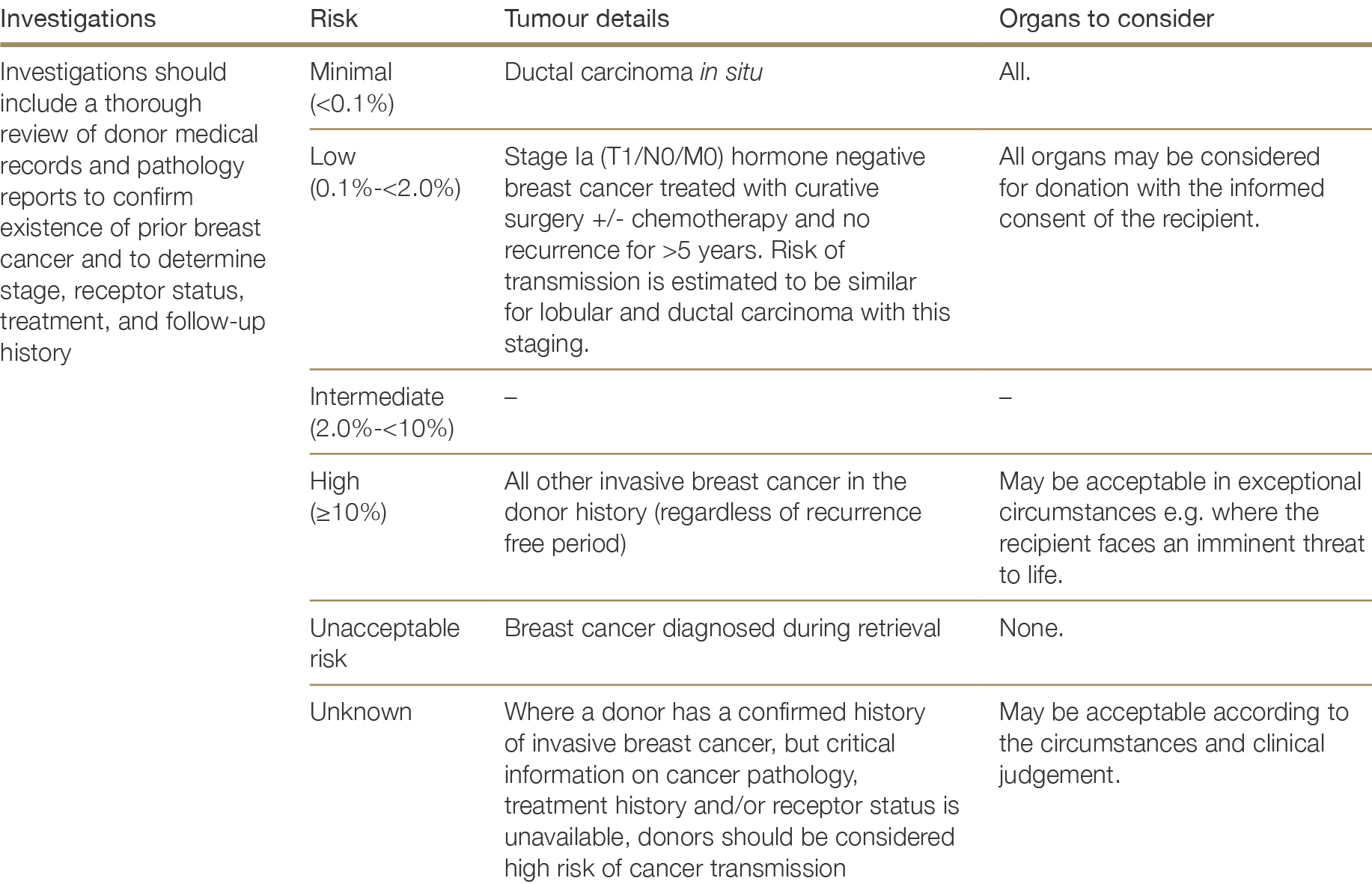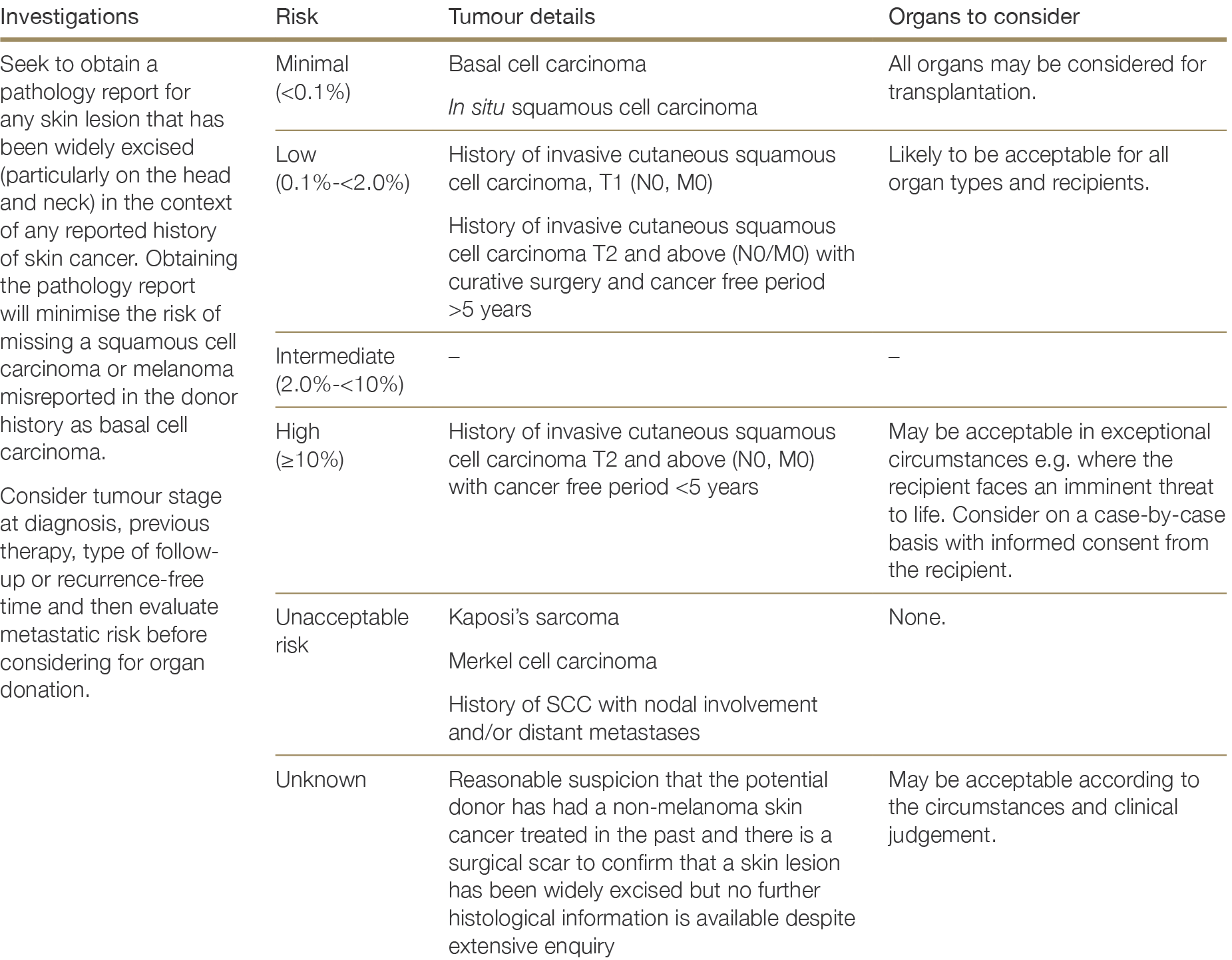 Isolated case reports from the literature demonstrate fatal outcomes of transplantation in the context of unrecognised donor sarcoma.324,325 However, given the vast array of possible soft tissue and bone sarcomas and their heterogeneity with regards risk of recurrence and potential risk of transmission to recipients, potential donors with a history of treated sarcoma and a substantial recurrence-free period should be considered on a case by case basis.324 Detry O, De Roover A, de Leval et al. Transmission of an undiagnosed sarcoma to recipients of kidney and liver grafts procured in a non-heart beating donor. Liver Transpl, 2005; 11(6):696-9. Thoning J, Liu J, Bistrup C et al. Transmission of angiosarcomas from a common multiorgan donor to four transplant recipients. Am J Transplant, 2013; 13(1):167-73. 325 Thoning J, Liu J, Bistrup C et al. Transmission of angiosarcomas from a common multiorgan donor to four transplant recipients. Am J Transplant, 2013; 13(1):167-73.×