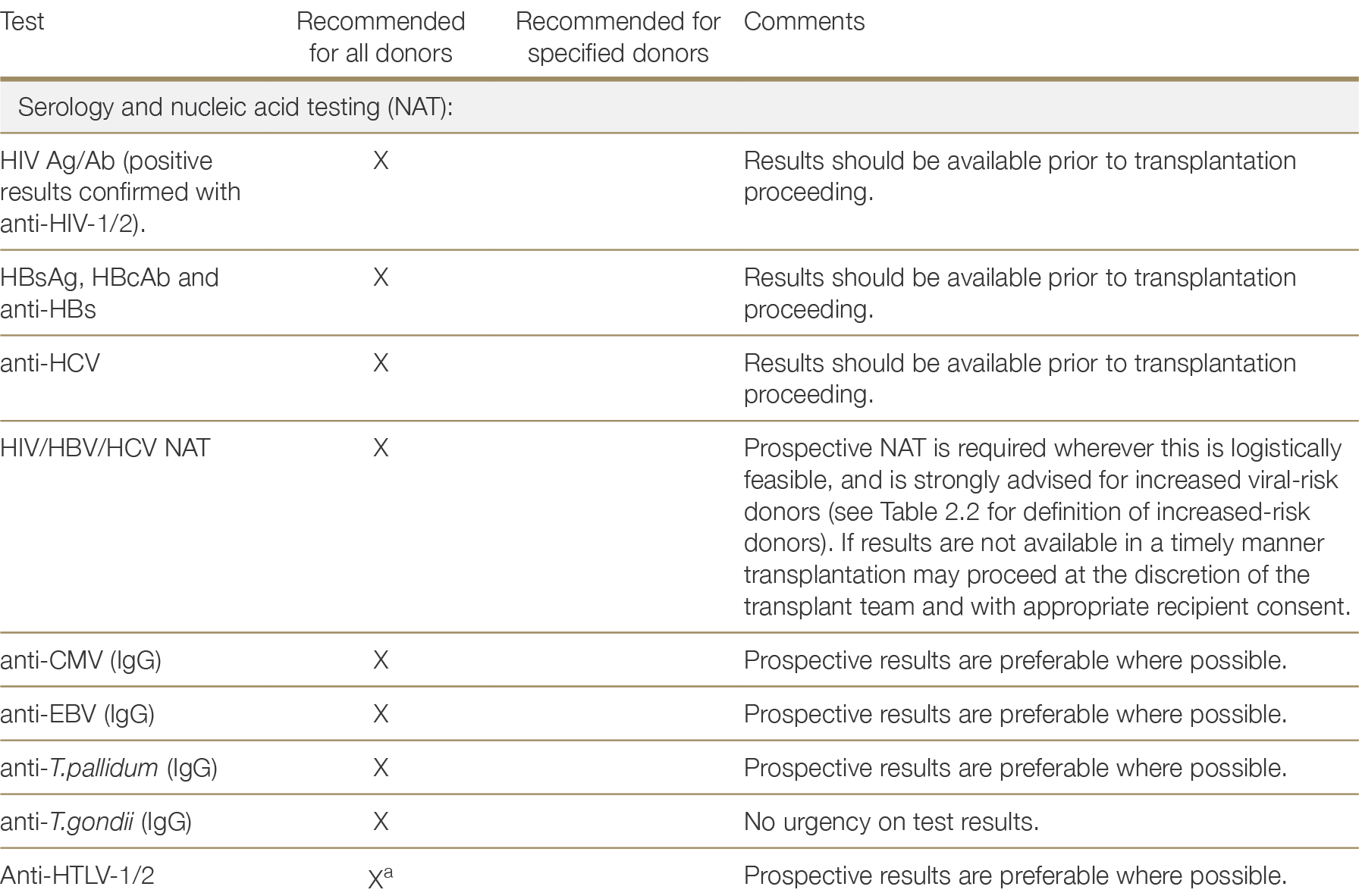 Table 2.1 provides details of which donors should receive the tests specified above and whether results are recommended prospectively. “Prospective results” in the context of organ donation refers to results that are made available prior to the transplantation of organs (as opposed to prior to organ retrieval). Test results that are not recommended to be made available prospectively should be obtained as early as possible, but transplantation may proceed prior to results being available.