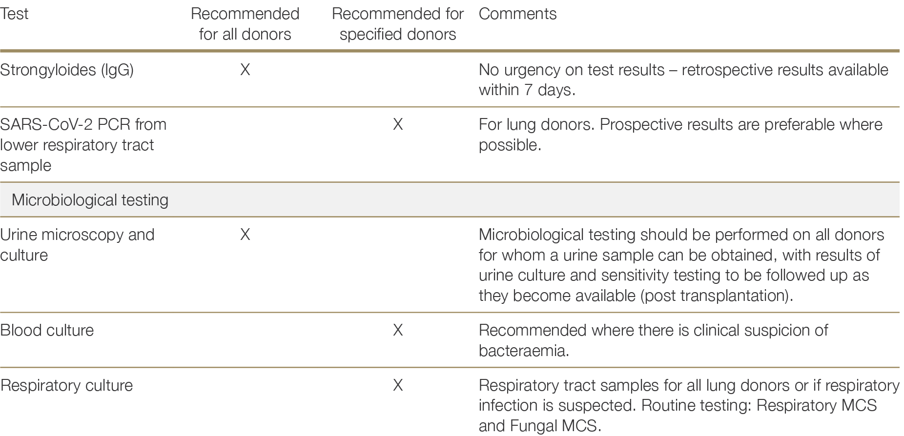 Urine microscopy and culture is recommended for all donors from whom a urine sample can be obtained, with the results of cultures and sensitivity testing to be followed up as soon as they become available (which may not be until after transplantation has occurred). Blood cultures are recommended only if there is clinical suspicion of bacteraemia. A respiratory tract sample (i.e; endotracheal aspirate, sputum or bronchoscopic sample), bacterial culture, fungal culture and SARS-CoV-2 PCR is recommended for all lung donors.