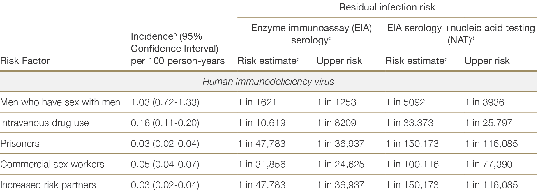 Table 2.2: Criteria for identifying organ donors at increased risk for HIV, HBV, and HCV infection (MSM= men who have sex with men; derived from Jones18)18 Jones JM, Kracalik I, Levi ME et al. Assessing Solid Organ Donors and Monitoring Transplant Recipients for Human Immunodeficiency Virus, Hepatitis B Virus, and Hepatitis C Virus Infection - U.S. Public Health Service Guideline, 2020. MMWR Recomm Rep. 2020 Jun 26;69(4):1-16. ×