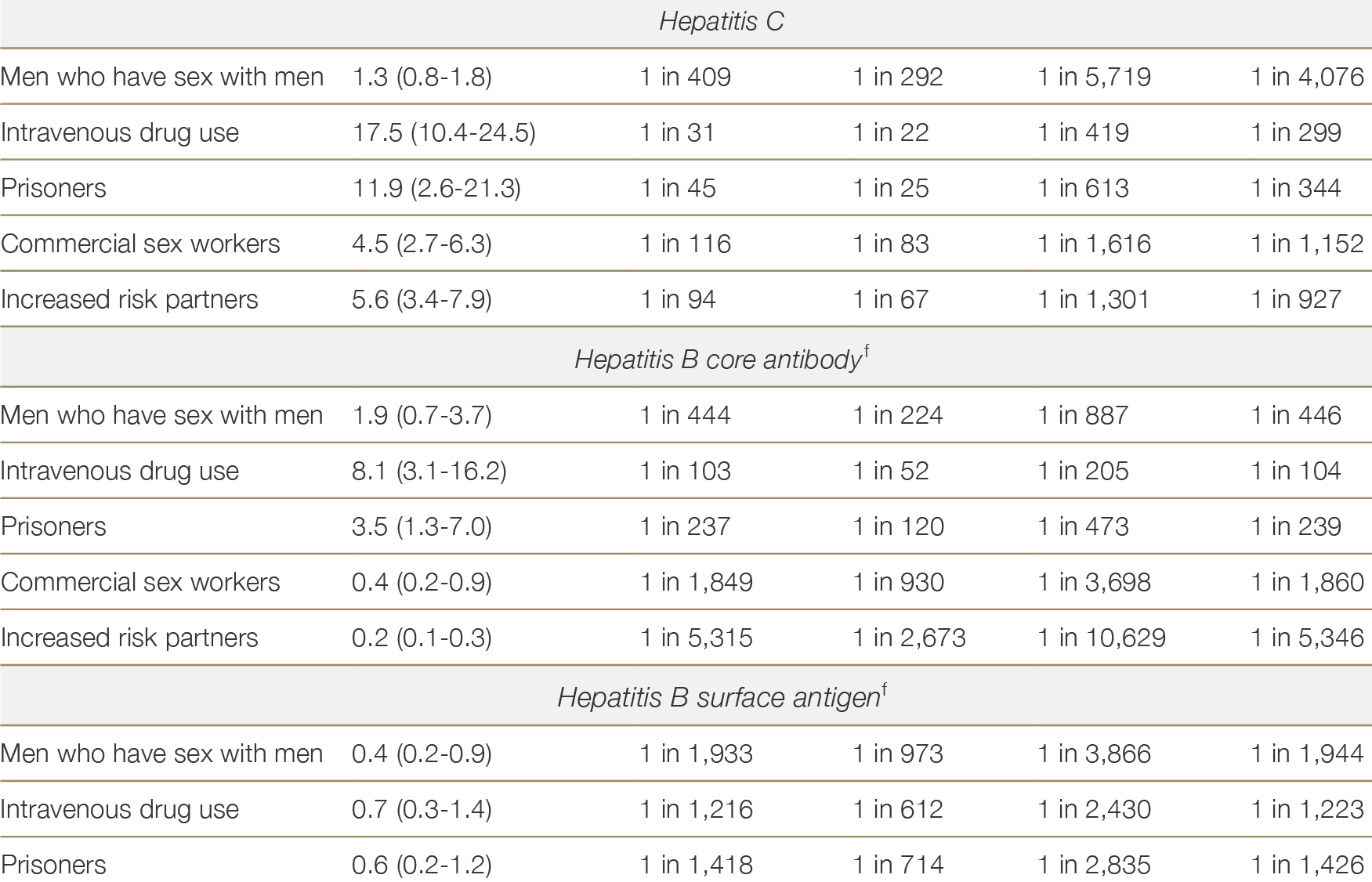 Risk factors for the transmission of human immunodeficiency virus (HIV), hepatitis B virus (HBV) and hepatitis C virus (HCV), including non-medical injecting drug use, male to male sex, commercial sex work, time in prison, sex with a person at increased risk of these infections, or a young child of a mother at increased risk of these infections