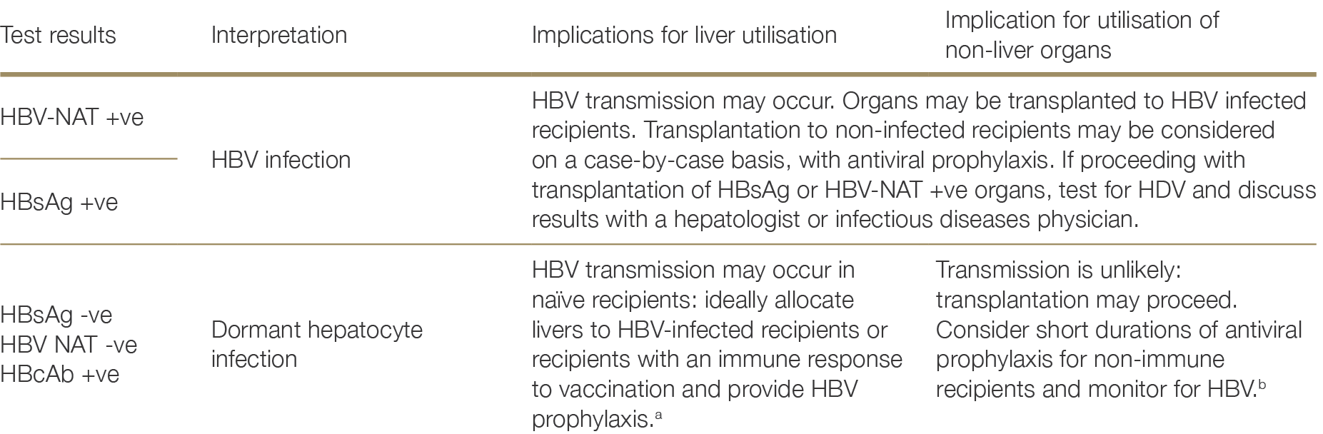 The presence of HIV, HBV or HCV in the donor is not a contraindication to donation. Decisions about whether to proceed with donation and transplantation will depend on recipient informed consent, the nature of the infection, other recipient clinical factors and the availability of effective treatment. The presence of HIV usually rules out donation, with exceptions including for recipients living with HIV., similarly, recipients who are adequately immunised against or given prophylactic treatment for HBV may be transplanted with organs from donors with the potential to transmit HBV. The presence of HCV in a donor is no longer a barrier to transplantation given the availability of curative treatment. See Sections 2.3.2.4 and 2.3.2.5 for more detail.