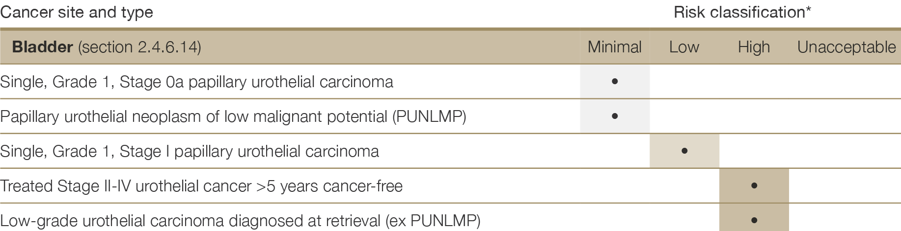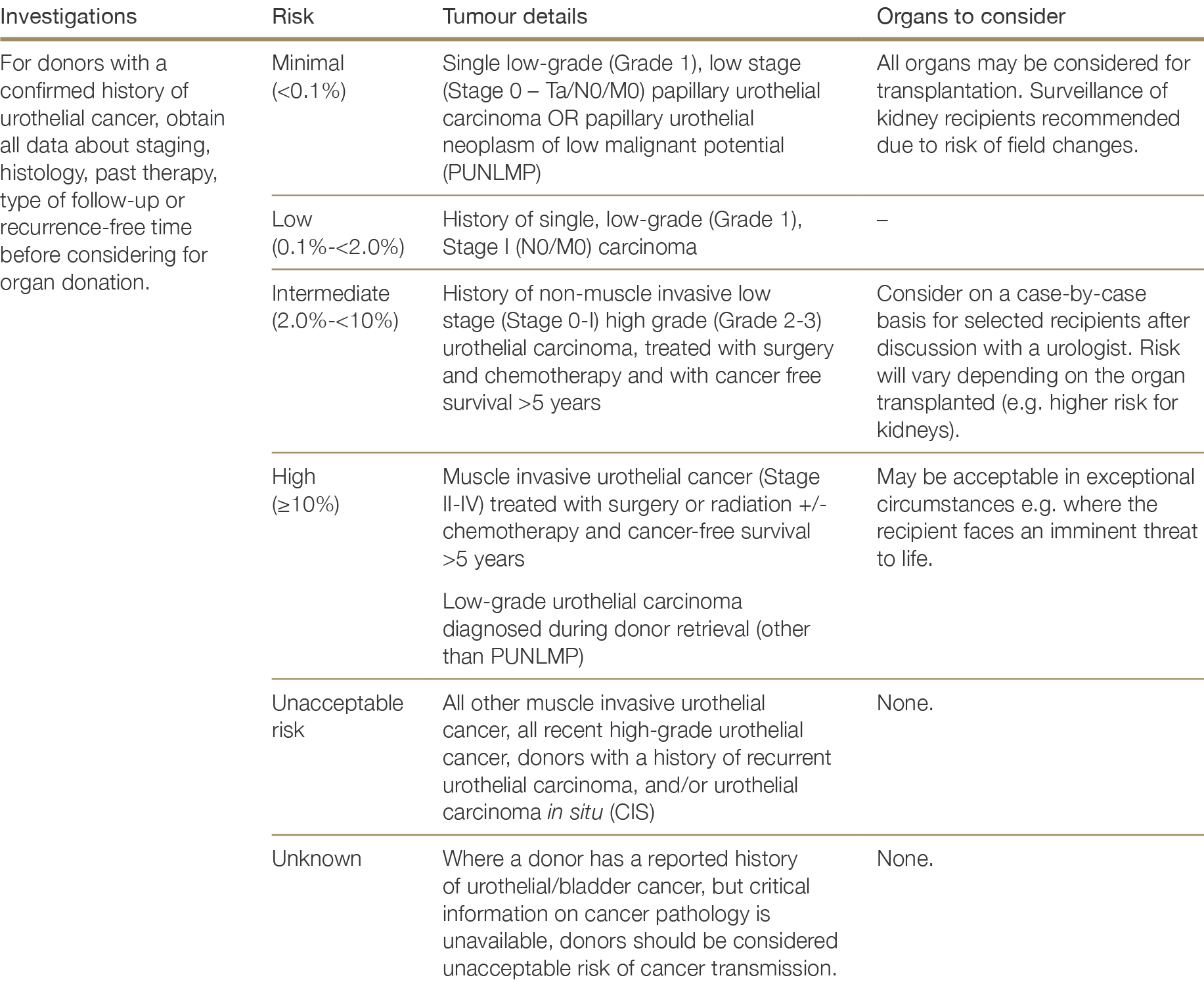 Superficial, non-invasive papillary carcinoma of the bladder is not a contraindication to organ donation; however, it is important to establish that the cancer is low-grade before proceeding with donation. If urothelial cancer is diagnosed during retrieval, the advice of a urologist should be sought in assessing the tumour prognosis/ behaviour in the donor.