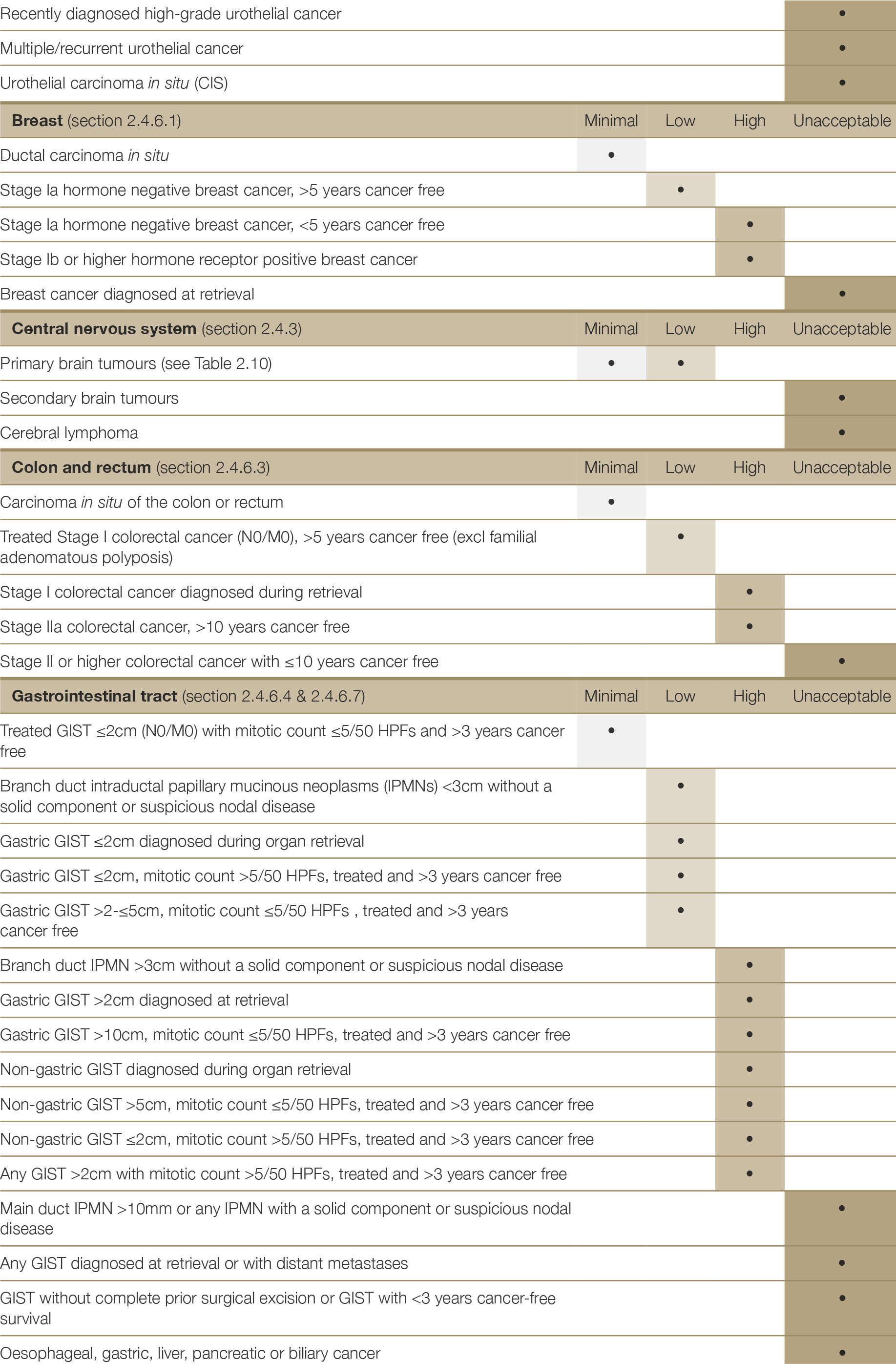 Table 2.11: Actions in the event of confirmed diagnosis of donor malignancy