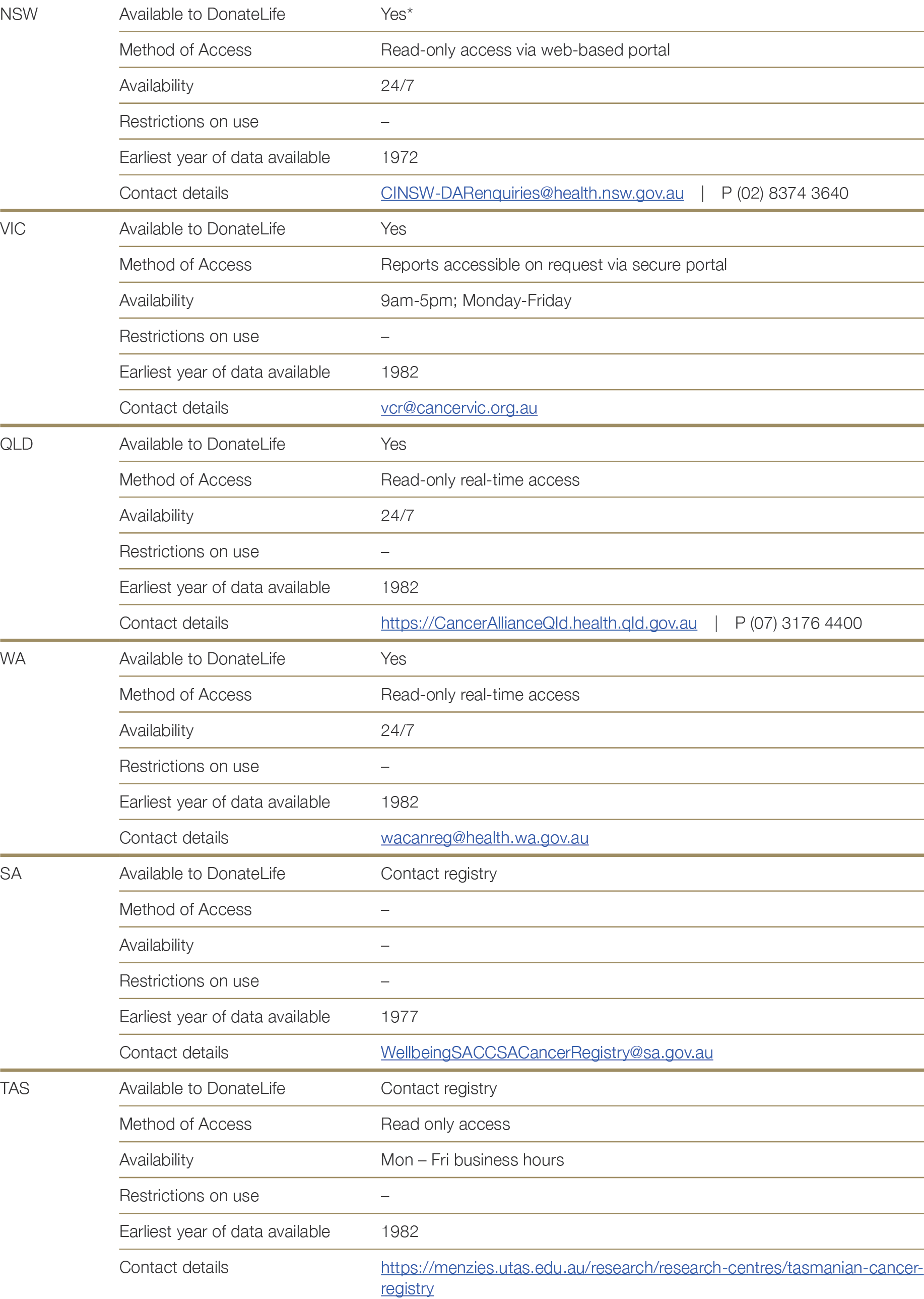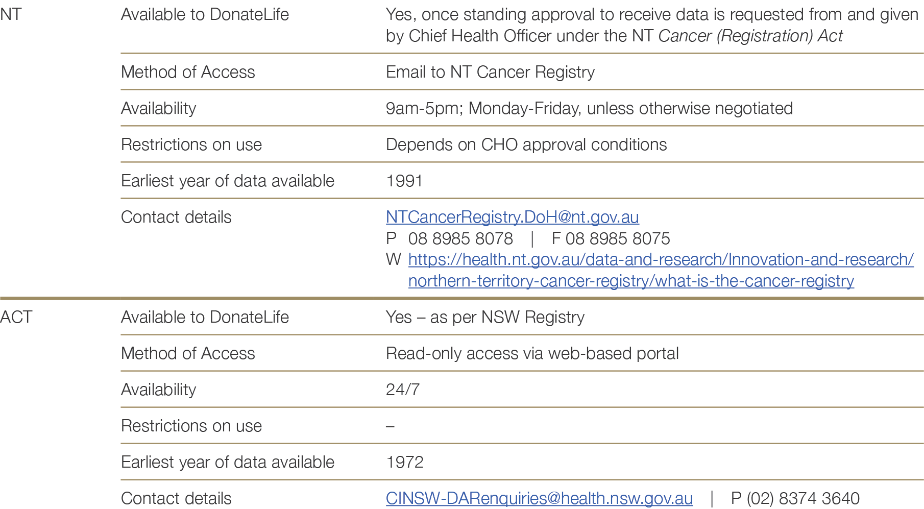 Obtaining a thorough medical, behavioural and travel history of the donor, performing a careful clinical examination and undertaking suitable investigations are critically important to the quality, safety and efficacy of organ donation. The accuracy of this information is critical to the assessment of the degree of risk to which the recipient of an organ from a given donor may be exposed. When interviewing next-of-kin and/or significant others regarding the history of a potential donor, it is important that this is done in a structured and standardised manner, utilising best practice tools such as the Australian Donor Risk Assessment Interview (AUS DRAI), to balance the rigorous requirements of screening with compassion, patience and empathy. In Australia, the donor’s medical history, examination and investigations are captured in an electronic donor record (EDR), which is completed for all donors, with the relevant information components provided to transplant units when organs are offered for transplantation. In New Zealand, the donor’s medical history, examination and investigations are captured in a Confidential Donor Referral (CDR), which is completed for all donors, with the relevant information components provided to transplant units when organs are offered for transplantation.