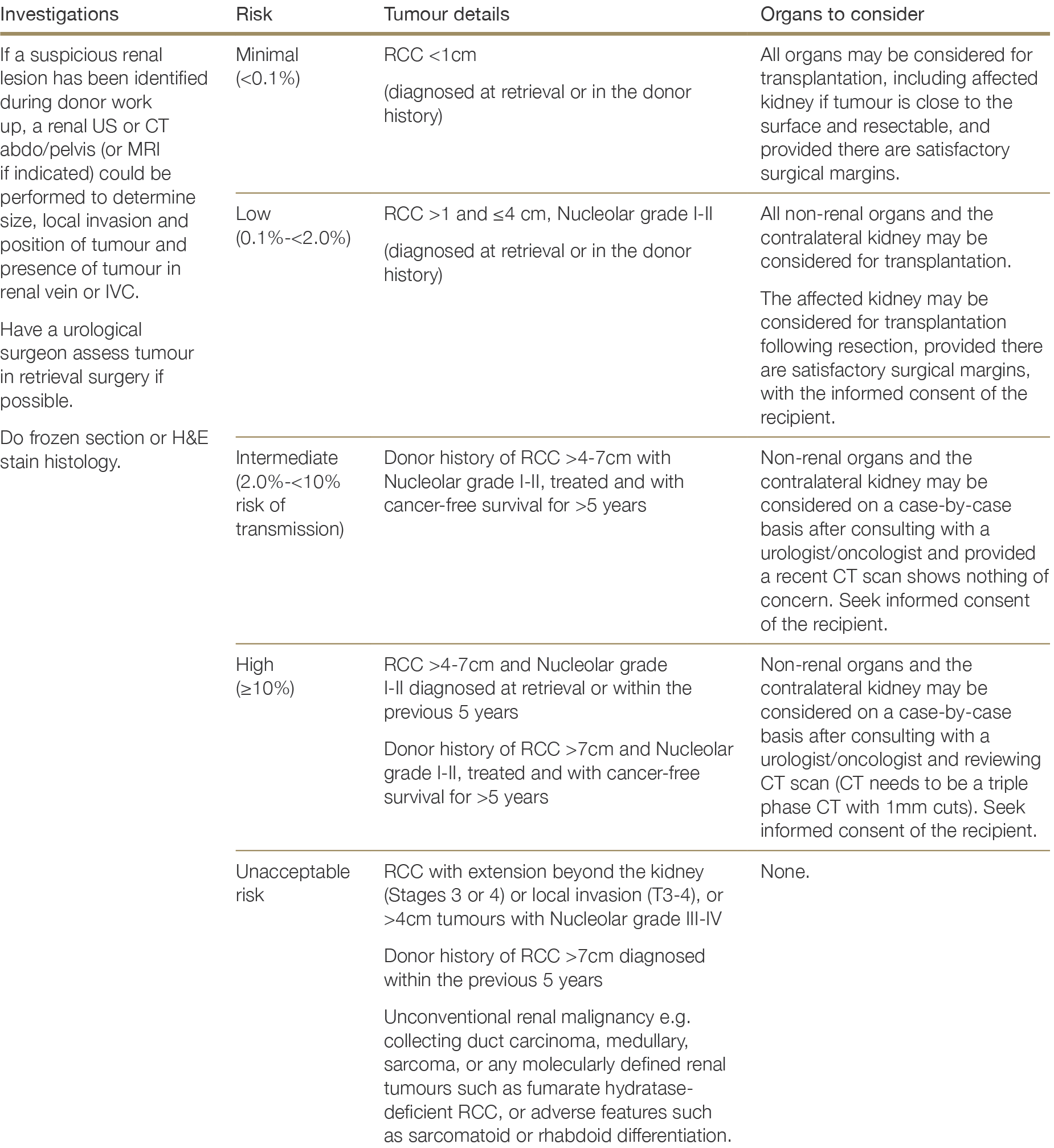 In the case of a solitary, well-differentiated RCC, the risk of malignancy transmission is minimal (<0.1%) where the tumour is ≤1.0 cm in size, or low (approximately 0.1 – 2.0%) for tumours >1.0 cm to ≤4 cm in size. All organs may be considered for transplantation in the context of an T1a RCC ≤4 cm with nucleolar grade I-II, including transplantation of the affected kidney following tumour resection, provided satisfactory margins are achieved and imaging of the urinary tract has excluded multifocal cancer deposits.202,310,311 When imaging is not available, the risk assessment may include a discussion with a subject expert.202 Transplantation of Organs from Deceased Donors with Cancer or a History of Cancer. Advisory Committee on the Safety of Blood, Tissues and Organs (SaBTO), UK Government Department of Health, London, UK, 2014. 310 Nicol DL, Preston JM, Wall DR, et al. Kidneys from patients with small renal tumours: a novel source of kidneys for transplantation. BJU Int. 2008;102(2):188-92. 311 Nalesnik MA, Woodle ES, Dimaio JM, et al. Donor-transmitted malignancies in organ transplantation: assessment of clinical risk. Am J Transplant, 2011;11(6):1140-7. ×