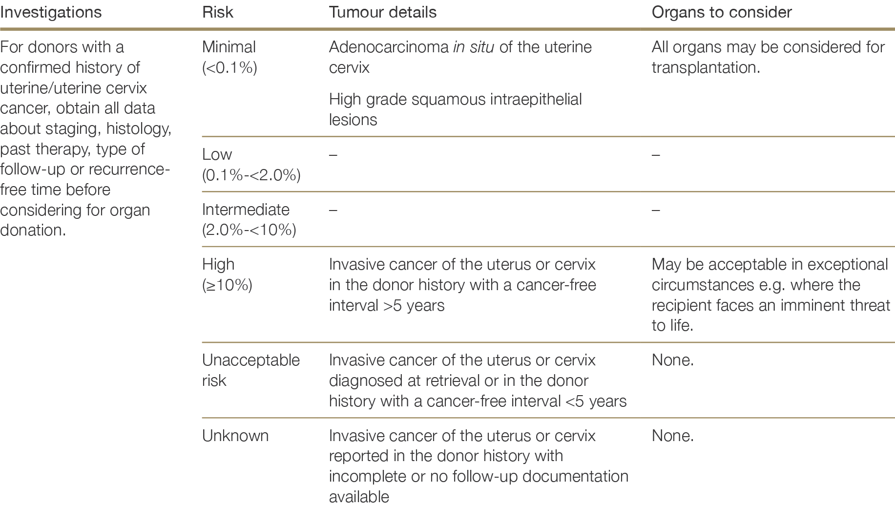 Invasive uterus or uterine cervix cancer (Stage I or higher) diagnosed at the time of organ retrieval poses an unacceptable risk to organ transplantation. For donors with a history of invasive uterus or uterine cervix cancers, transmission risk may diminish after a disease-free interval of >5 years, however there are minimal data from the literature to support a recommendation, and donors should be assessed on a case-by-case basis.